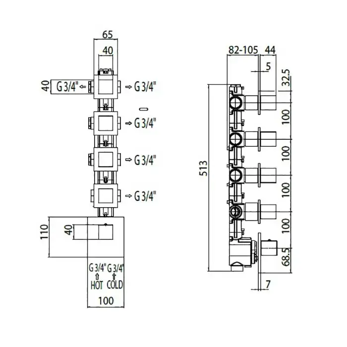 Bossini Cube Термостат для душа, встраиваемый, с девиаторм/3 запорных вентиля на 5 выходов, уст-ка верт/гор., цвет: хром