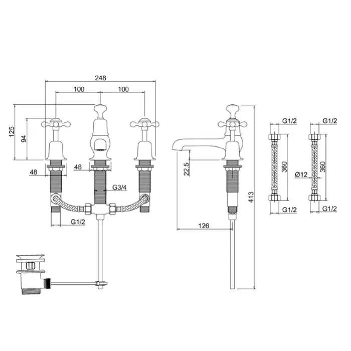 Burlington Claremont Смеситель для раковины на 3 отверстия, излив 2,2h см, цвет: хром/черный глянец CL12-QT BLA