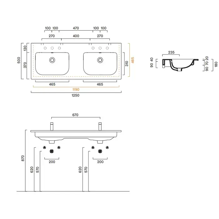 Catalano Italy Раковина 125x50см двойная, с 2 отв., цвет: белый глянцевый