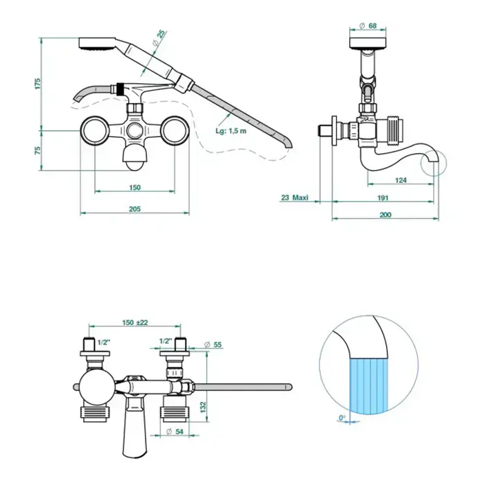 THG Diplomate grooved rings Смеситель для ванны, настенный монтаж, с ручным душем и шлангом 1500 мм., цвет: хром/золото