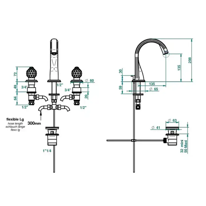 THG Mandarine Cristallia Diamant Смеситель для раковины на 3 отверстия, с донным клапаном, цвет: хром