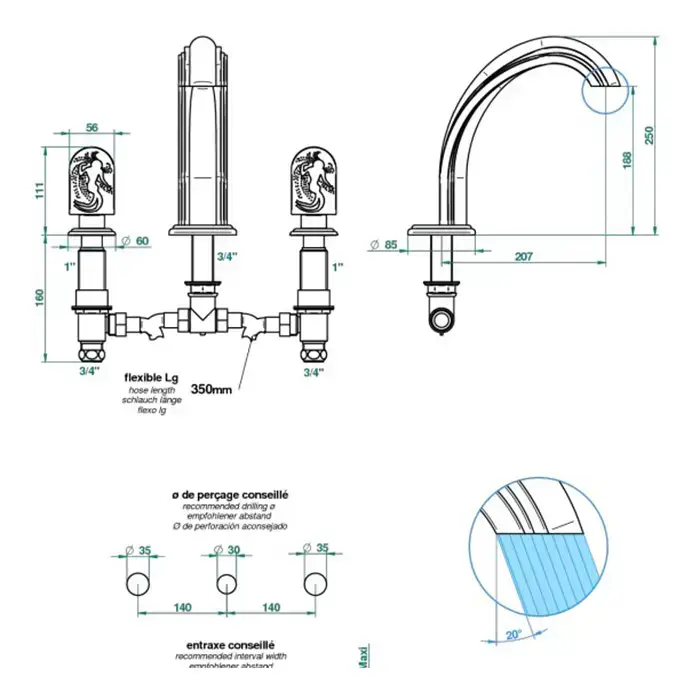 THG Naïade Смеситель для раковины, 3 отв., цвет: хром/прозрачный хрусталь