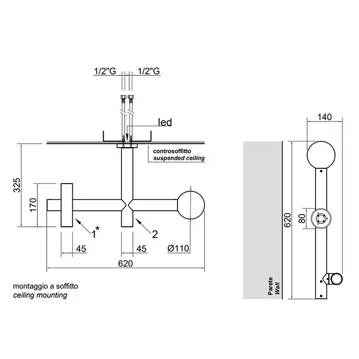 Antonio Lupi Apollo Верхний душ Ø45 мм., с LED подсветкой, потолочный монтаж, с 2 изливами, цвет: черный матовый