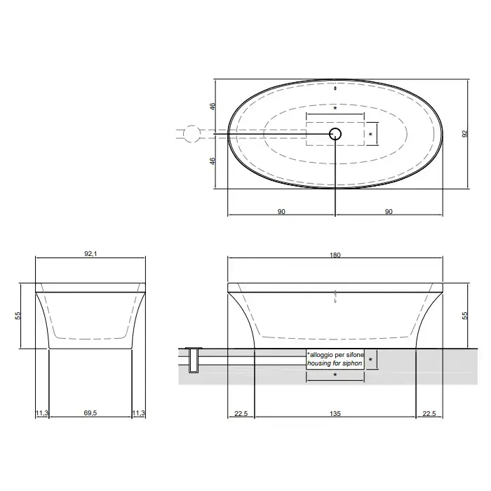 Antonio Lupi Epoque Ванна отдельностоящая 180х92х55см, из натурального камня, цвет: Pietra Luna