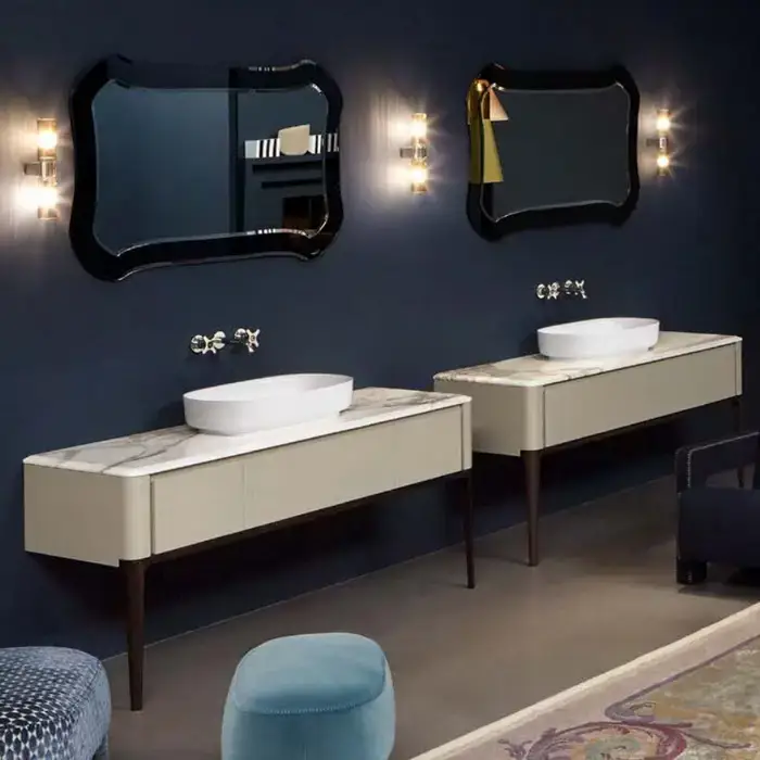 Antonio Lupi ILBagno Комплект мебели: тумба напольная с 2 раковинами 198x54см цвет: Blu navy lucido, мраморная столешница, 2 зеркала и 2 смесителя
