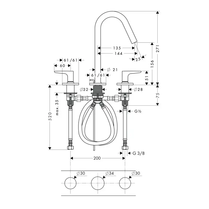 Axor Citterio M Смеситель для раковины на 3 отверстия с дон. клап., цвет: полированный черный хром 34133330
