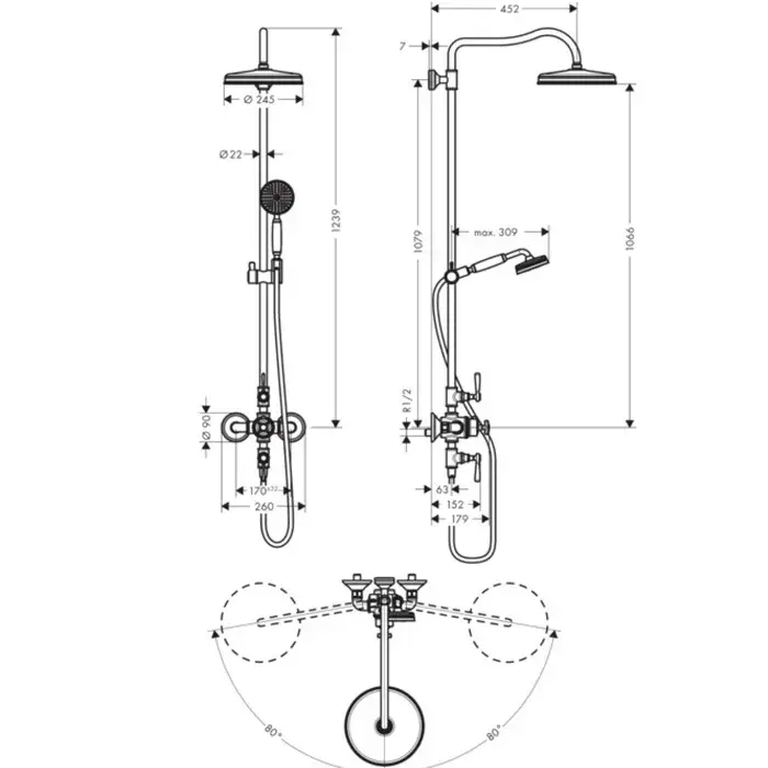 Axor Montreux Душевая стойка: термостат, верхний душ 24 см, лейка, цвет: шлифованный никель 16572820