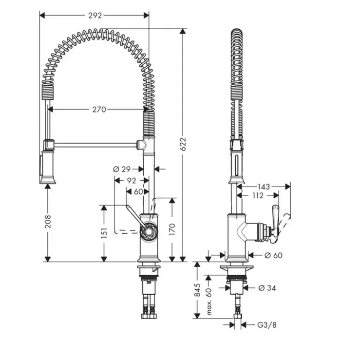 Axor Montreux Смеситель для кухни с гибким изливом, на 1 отв., 2 режима струи, цвет: нерж. сталь 16582800