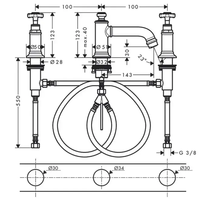 Axor Montreux Смеситель для раковины на 3 отверстие с донным клапаном, цвет: шлифованный никель 16536820