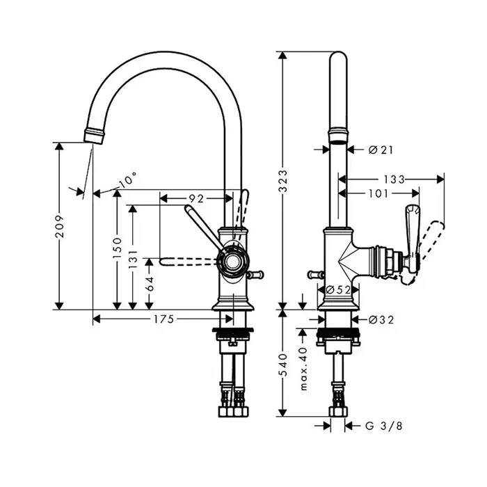 угол поворота излива: 120°; тип струи: обычная струя