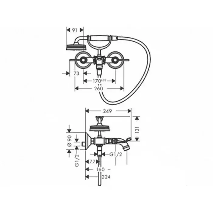 Axor Montreux Смеситель для ванны, 2 рычага, ручной душ, шланг, излив 22,4 см, цвет: хром 16551000