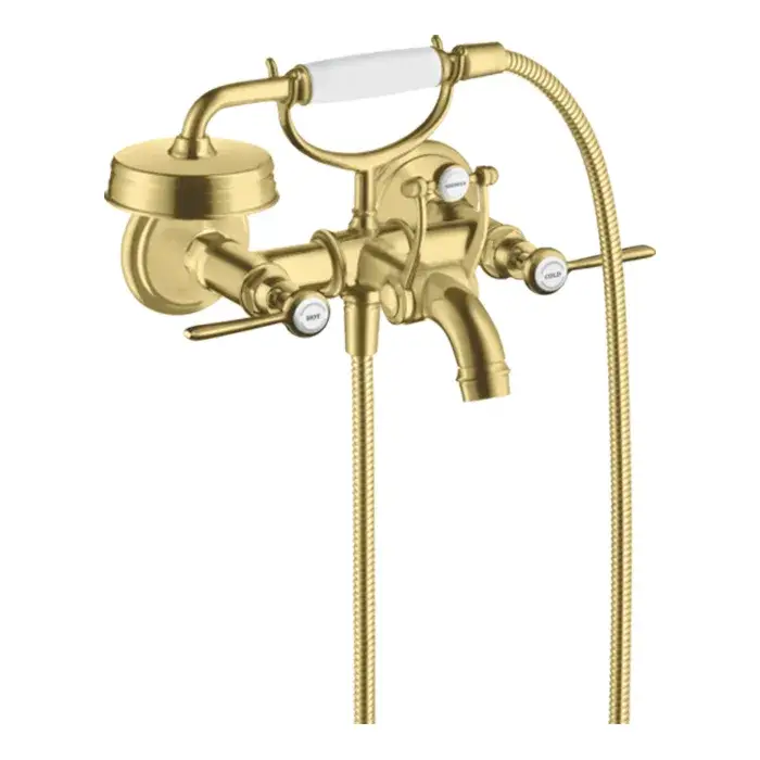 Axor Montreux Смеситель для ванны, 2 рычага, ручной душ, шланг, излив, цвет: шлифованная латунь 16551950