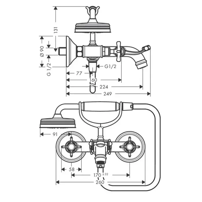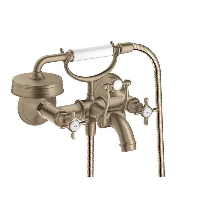 Axor Montreux Смеситель для ванны, 2 вентиля, ручной душ, шланг, излив, цвет: шлифованный никель 16540820