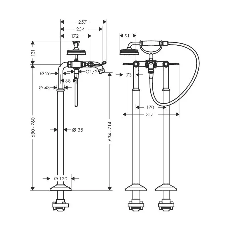 Axor Montreux Смеситель для ванны, напольный, на 2 отв., с ручным душем, цвет: хром 16553000