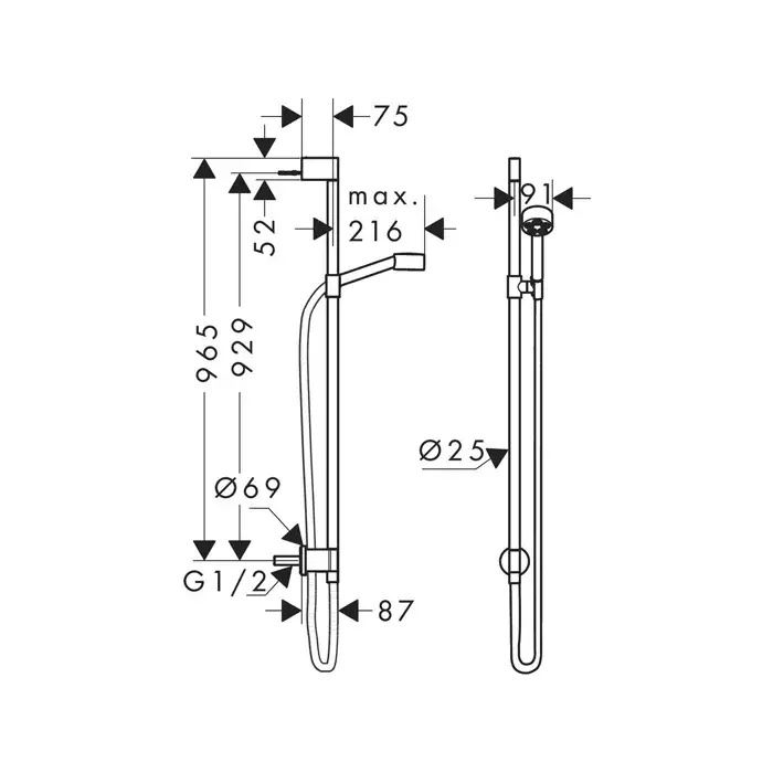 Axor One Душевой гарнитур: лейка 1 вид струи EcoSmart, штанга 96 см, цвет: полированный черный хром 48791330