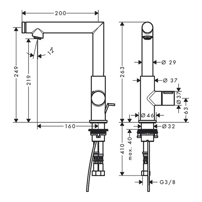 угол поворота излива: 110°; тип струи: обычная струя