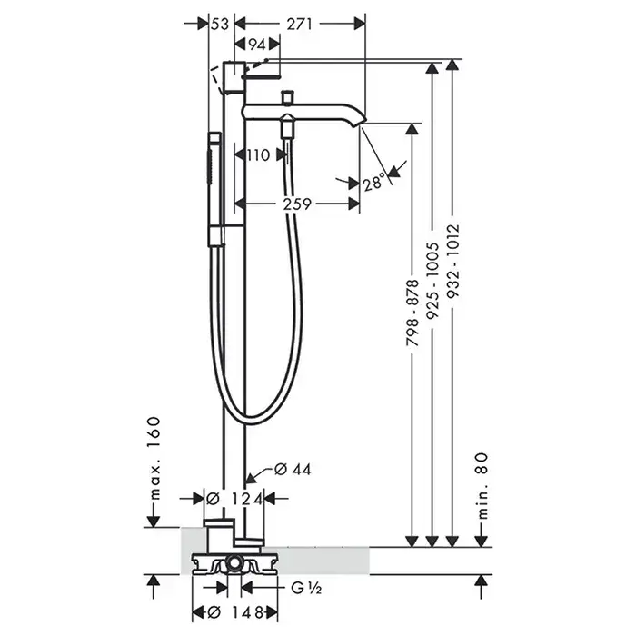 Axor Uno Смеситель для ванны, напольный, с рукояткой-петлей, с ручным душем "палочка", цвет: хром 38442000