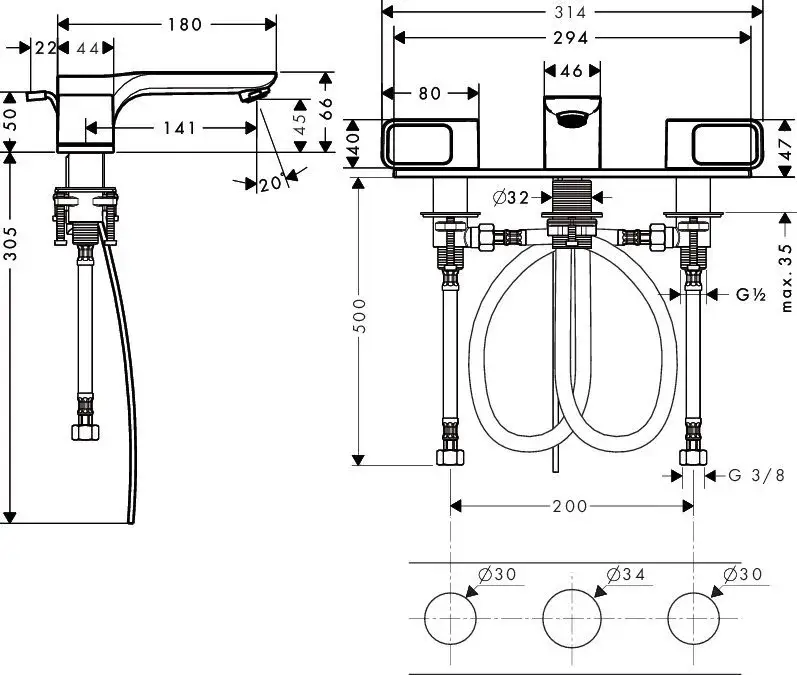 Axor Urquiola Смеситель для раковины двухвентильный на 3 отверстия с донным клапаном, цвет: хром 11040000