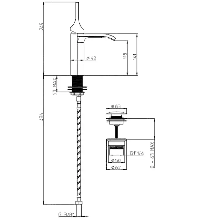 Bossini Aki Line Смеситель для раковины AKI-T высокий с донным клапаном 1"1/4 и гибкая подводка из нерж. стали 3/8"., цвет: хром