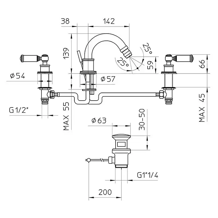 Bossini Liberty Смеситель для биде на 3 отверстия с поворотным изливом и заглушкой 1"1/4, цвет: никель матовый