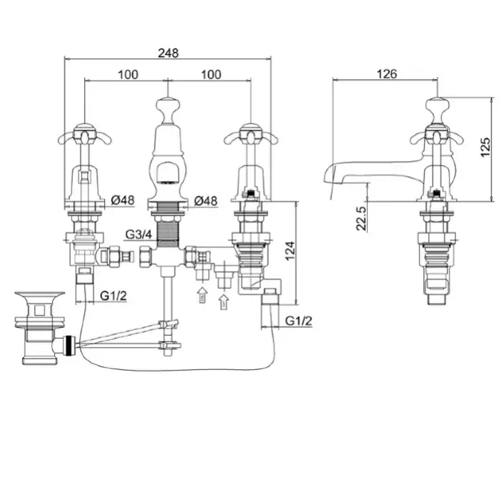 Burlington Anglesey Смеситель для раковины на 3 отверстия, излив 2,2h см, цвет: хром/белый глянец AN12-QT