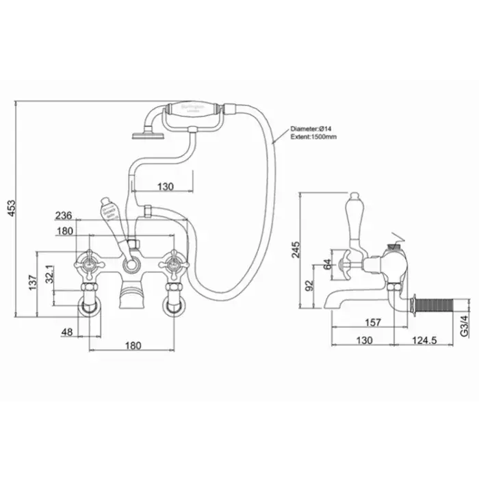 Burlington Anglesey Смеситель на борт ванны с изливом 13 см и ручным душем, цвет: хром глянец AN19-QT