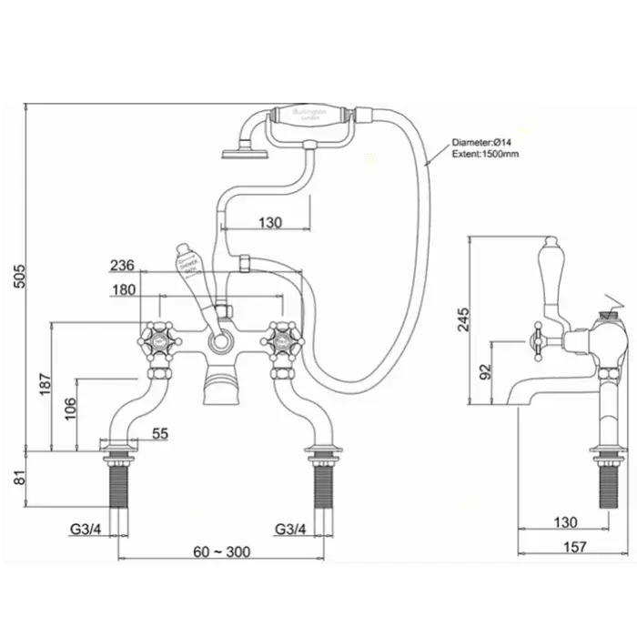 Burlington Birkenhead Смеситель на борт ванны излив 13 см, ручной душ, цвет: хром/черный глянец BIR15-QT BLA