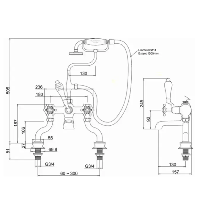 Burlington Birkenhead Смеситель на борт ванны, излив 13 см, ручной душ, цвет: хром/черный глянец BI15-QT BLA