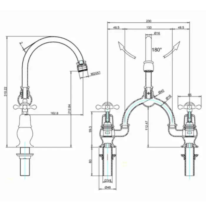 Burlington Claremont Смеситель для раковины на 2 отверстия, излив 21h см, цвет: хром/белый глянец CL28-QT