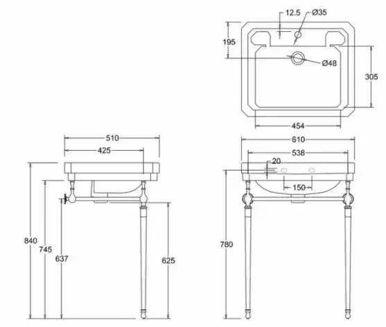 Burlington Edwardian Консоль под раковину B5 1TH, напольная 53,8х42,5х74,5h см, цвет: хром глянцевый T23A CHR