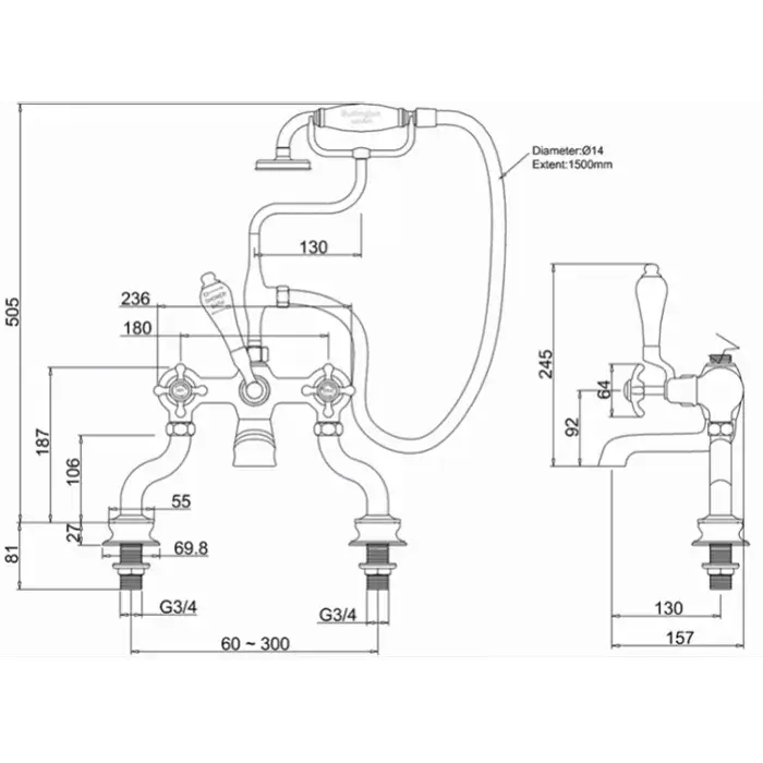 Burlington Regent Смеситель на борт ванны с изливом 13 см и ручным душем, цвет: хром/белый глянец BIR15-QT