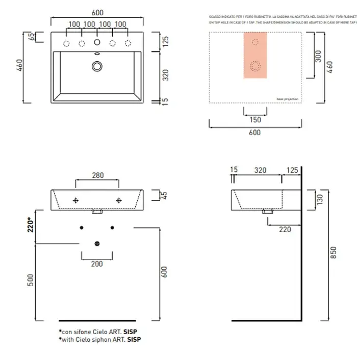 Cielo Smile Раковина подвесная 60х46хh13 см, 1 отв, цвет: глянцевый белый SMLAA60