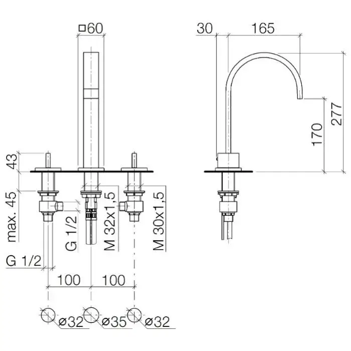 Dornbracht Tara Внешняя часть смесителя из стены на 3 отверстия, с вентилями, излив 16см, цвет: хром 36707892-00