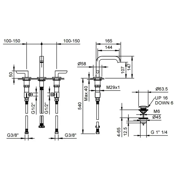 Fantini Icona Deco Смеситель для раковины, 3 отв., излив 16 cм, цвет оружейная сталь 53 P5 R107