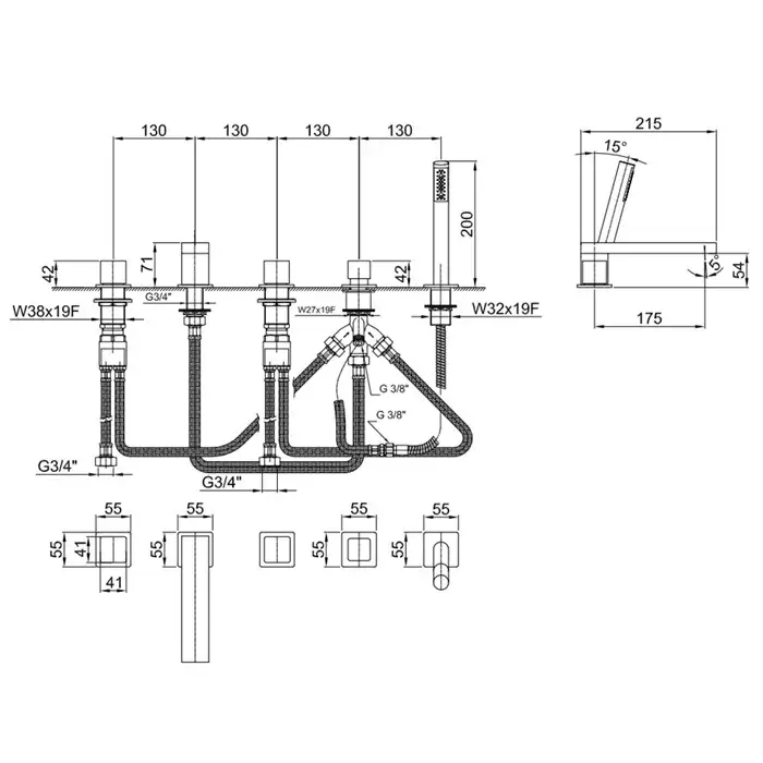 Fantini Mint Смеситель на борт ванны, 5 отв., с ручн душем, излив 17,5 cм, цвет хром 34 02 F165
