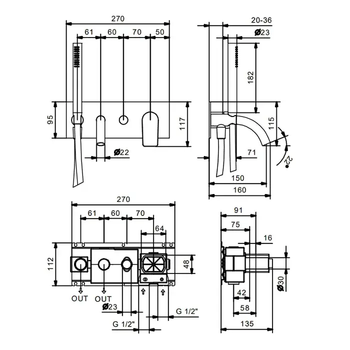 Fantini Myo Встраиваемый смеситель для ванны наружная часть, с ручной лейкой, цвет: хром 61 02 V620B