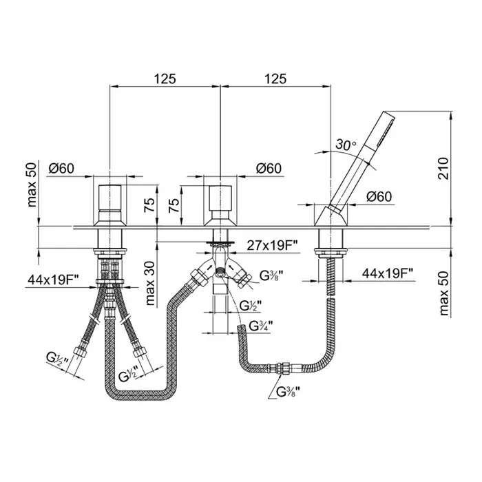 Fantini Nostromo Смеситель на борт ванны, на 2 источника, 3 отв., без излива, цвет хром 50 02 1667