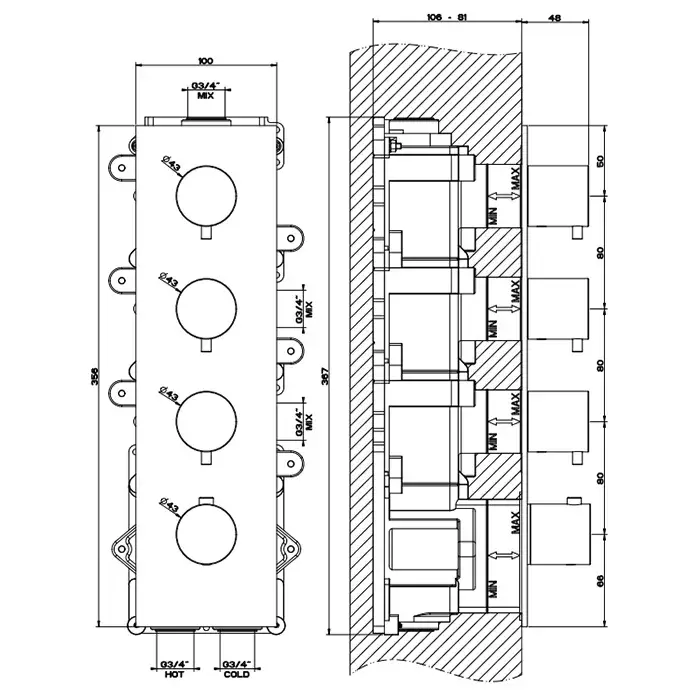Gessi 316 Внешняя часть встраиваемого в стену термост смес на 4 потр, цвет: black metal brushed PVD 54338#707