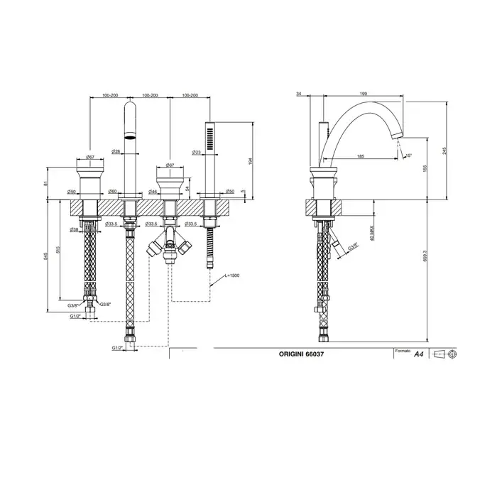 Gessi Origini Смеситель на борт ванны на 4 отв, с ручным душем-палочкой, цвет: Chrome 66037#031
