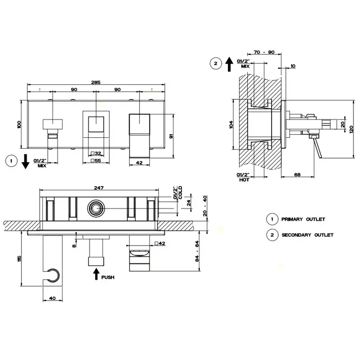 переключатель Push, подвод воды и держатель лейки