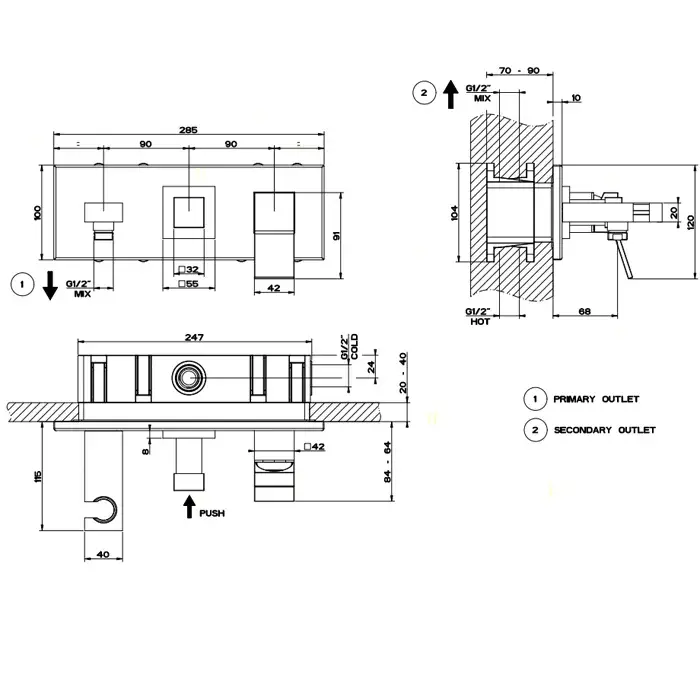 Gessi Rettangolo K Смеситель для ванны встраиваемый 2 потребителя,лейка, внешняя часть, цвет: chrome 53140#031