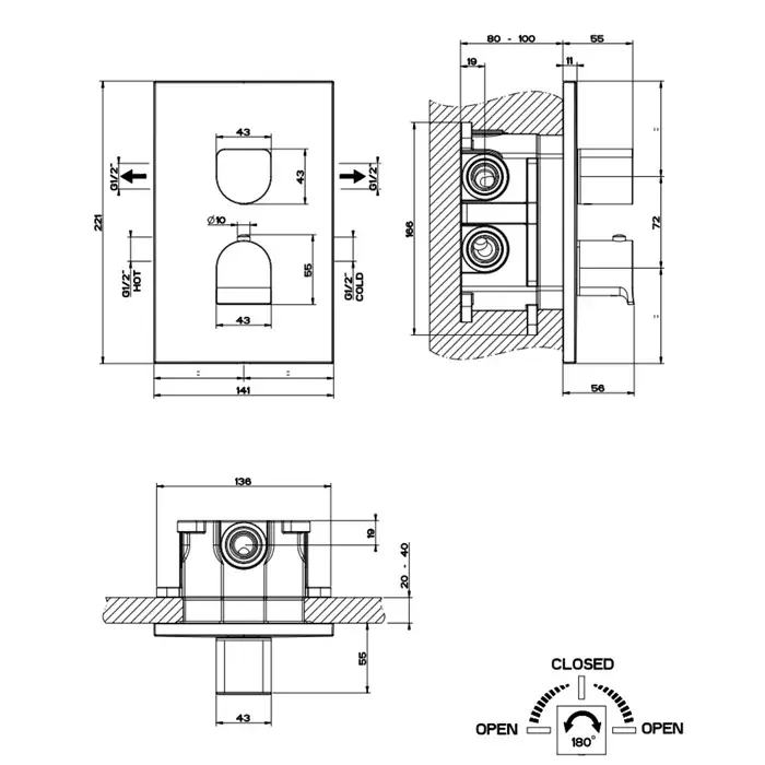 Gessi Rilievo Термостат для ванны встраиваемый, 2 потребителя, запорный вентиль, цвет: chrome 59134#031