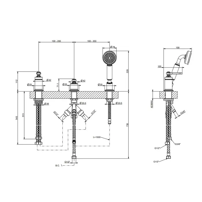 Gessi Venti20 Смеситель на борт ванны на 3 отверстия, без излива, с ручн. душем, цвет: chrome 65043#031