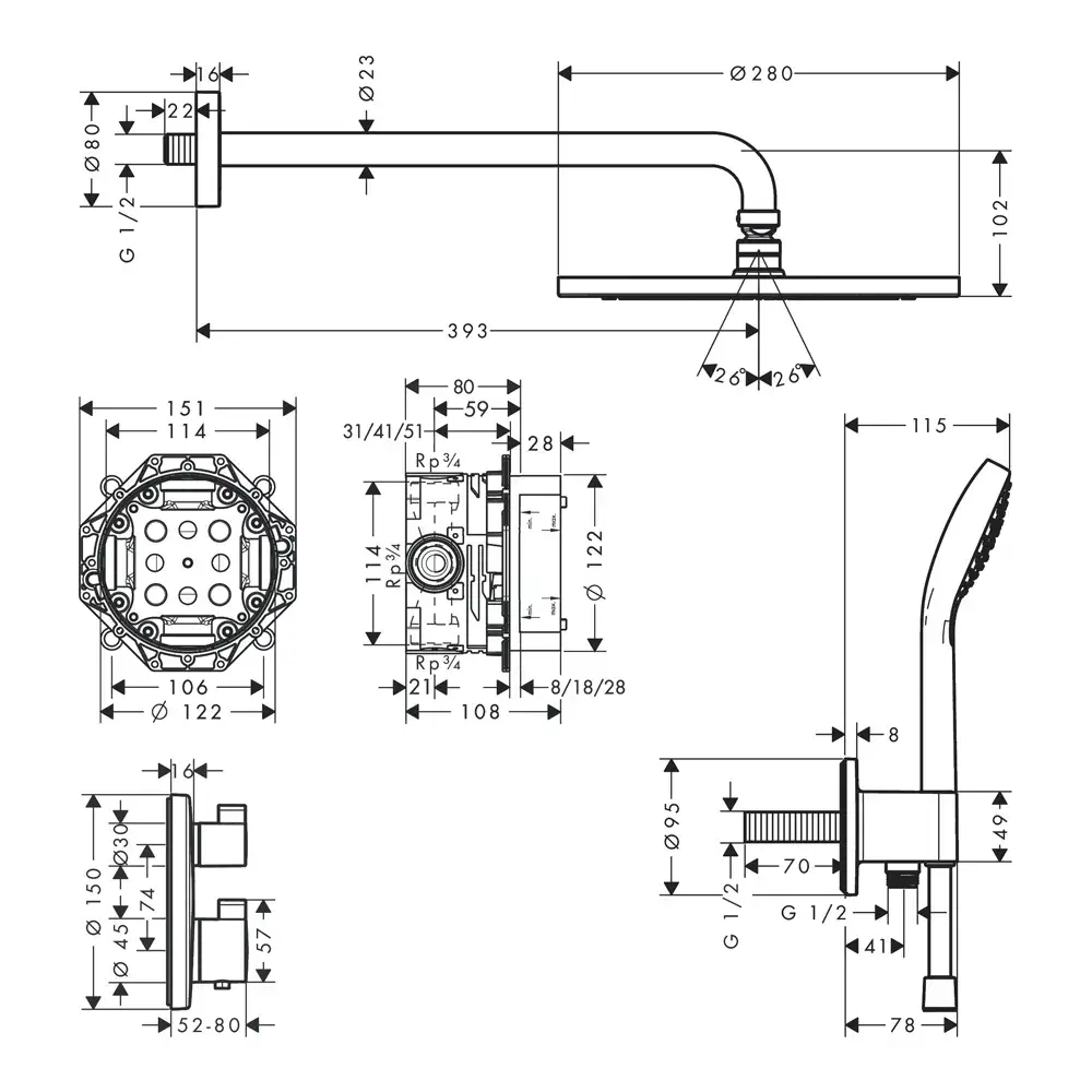 Hansgrohe Croma Душевой комплект: термостат, верхний душ 28 см, лейка 3 режима, цвет: хром 27954000