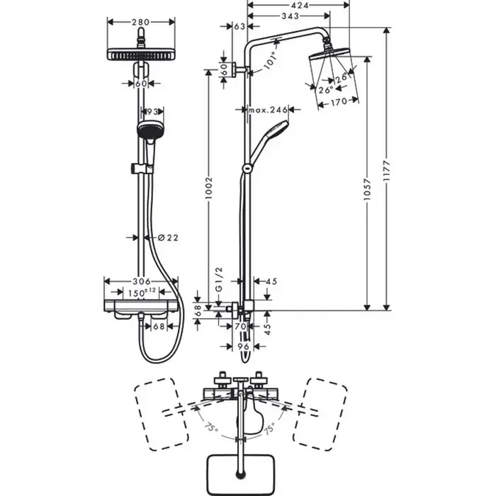 Hansgrohe Croma E Душевая стойка: термостат, верхний душ 28x17 см, ручной душ 3 режима, цвет: хром 27630000