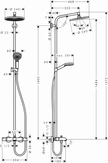 Смеситель, Дивертор, Кронштейн для верхнего душа, Шланг для душа, Держатель для душа