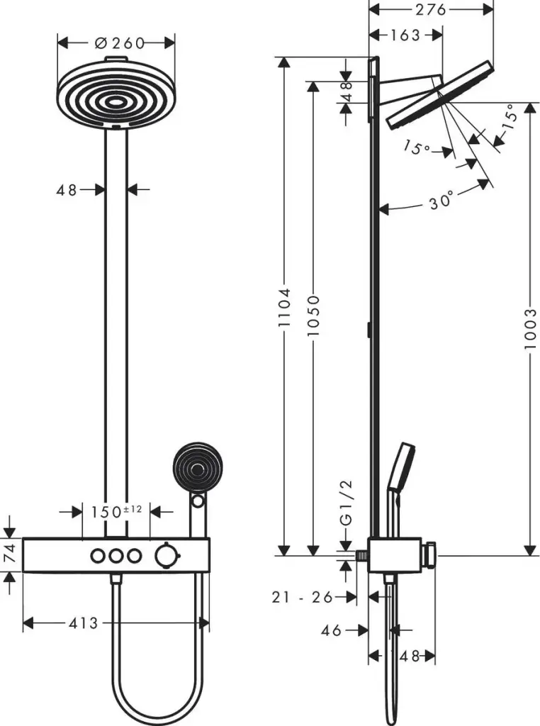 Hansgrohe Pulsify Душевая стойка: термостат, верхний душ 26 см, ручной душ 3 режима, цвет: хром 24240000