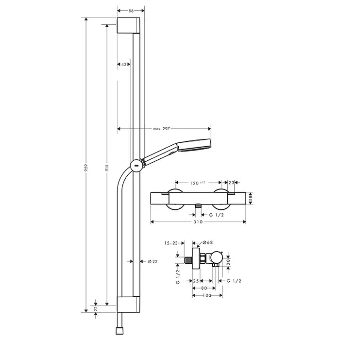 Ручной душ, Термостат для душа, Душевая штанга, Держатель, Шланг для душа