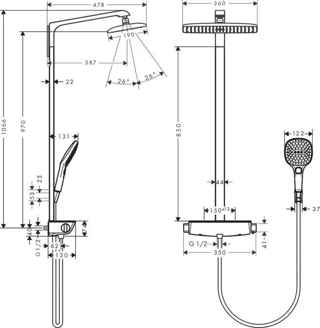 Hansgrohe Raindance E Душевая стойка: термостат,верхний душ EcoSmart 36x19 см,ручной душ, цвет: хром 27286000