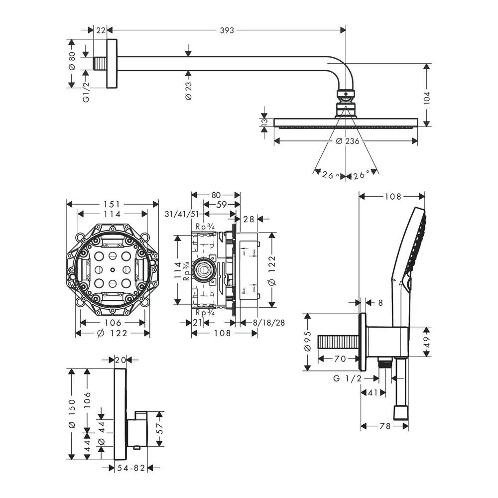 Hansgrohe Raindance S Душевой комплект: термостат, верхний душ 23,6 см, лейка 3 режима, цвет: хром 27951000